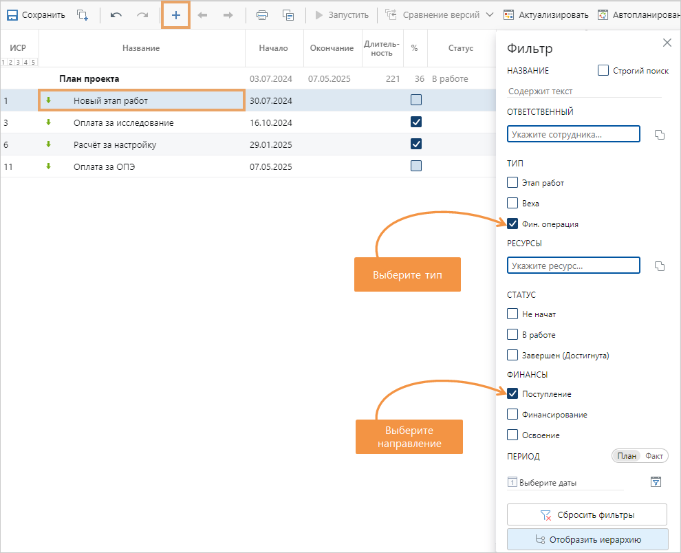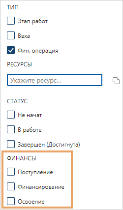 С помощью панели можно фильтровать этапы, разделы, вехи и финансовые операции проекта по критериям: