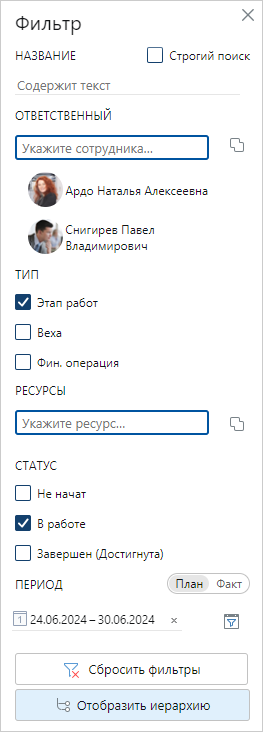Отображает элементы плана, в которых указаны выбранные ресурсы. Для изменения логики отображения ресурсов используйте кнопку-переключатель