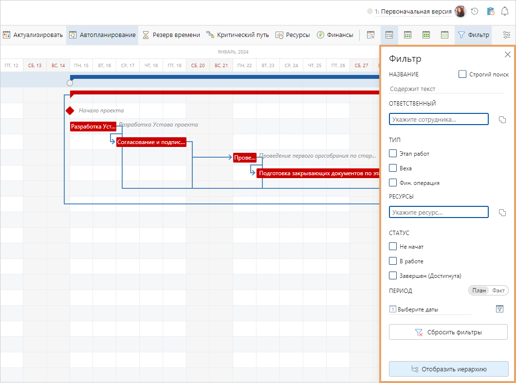 Панель фильтрации позволяет быстро перемещаться по плану проекта, а также работать только с элементами плана, имеющими определенный признак. Чтобы открыть панель фильтрации, нажмите на кнопку
