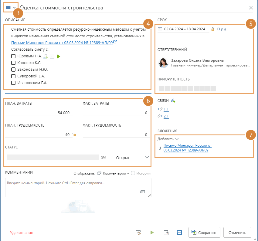 Ответственный. Укажите сотрудника, который будет отвечать за выполнение работ по этапу. Для этого нажмите на кнопку