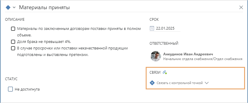 В результате в области Связи появится ссылка на контрольную точку с указанием плановой даты ее достижения.
