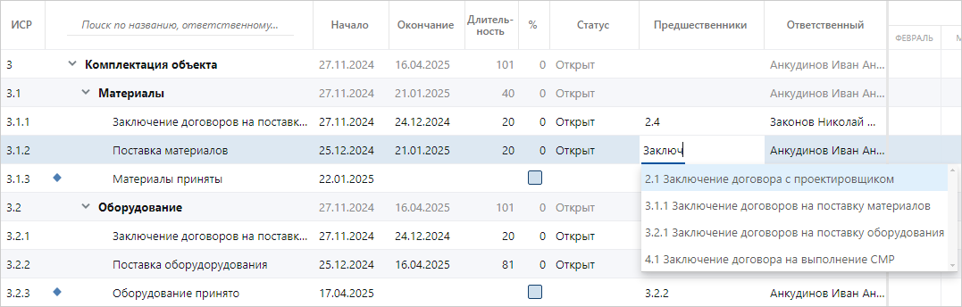 1.В табличной части плана в столбце «Предшественники» начните вводить номер или название предшественника, затем выберите его в выпадающем списке:
