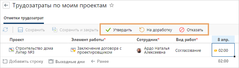 Руководитель может проверять и утверждать отметки трудозатрат по портфелю, программе или проекту, чтобы контролировать соответствие состава, трудоемкости и стоимости выполненных работ запланированным задачам и бюджету.