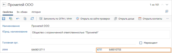 Если ваша организация работает только в Directum RX, то ответственный за контрагента или администратор вручную обновляет КПП в карточке контрагента. Для этого: