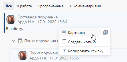 •чтобы изменить текст всех пунктов составного поручения, в списке «Поручения» найдите и откройте карточку любого пункта составного поручения, в котором требуется изменить текст. Откройте карточку главной задачи составного поручения. Для этого в области переписки в контекстном меню задачи выберите пункт Карточка.