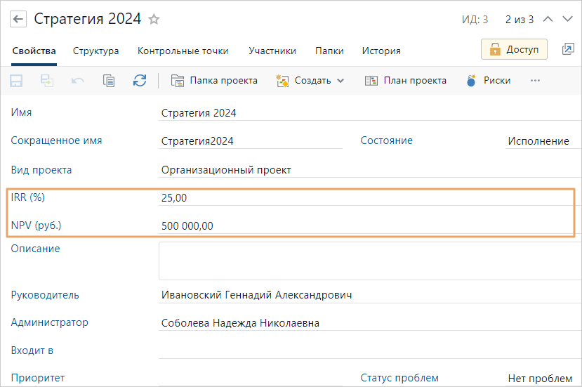 Руководитель проекта отслеживает внутреннюю норму доходности (IRR) и чистую приведенную стоимость (NPV). Чтобы эта информация была под рукой, на форму карточки проекта необходимо добавить два поля: IRR (%) и NPV (руб.).