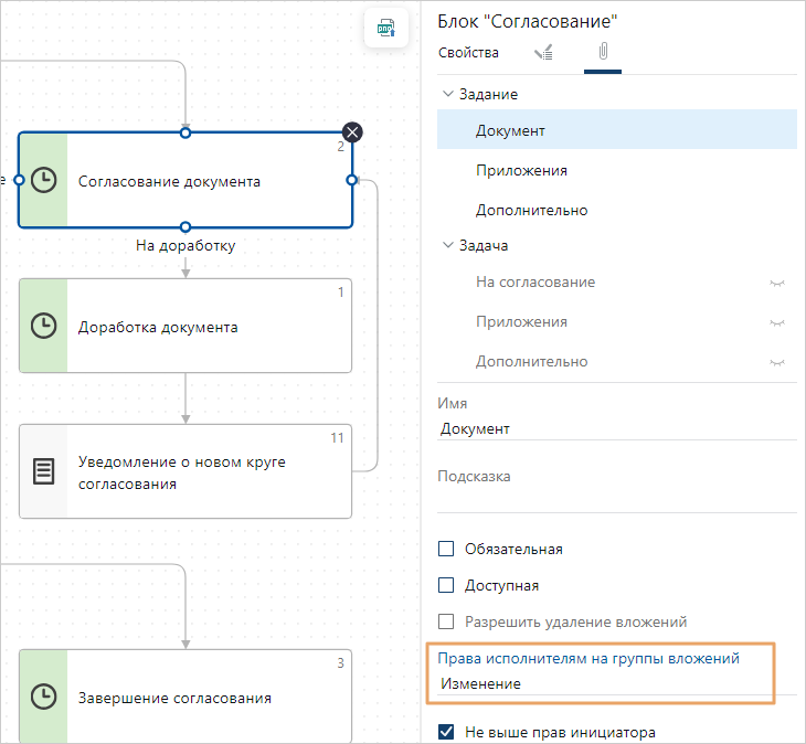 В блоках «Задание» и «Уведомление» параметр позволяет настраивать права на группы вложений.