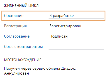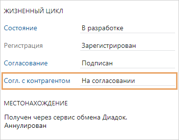 Плюсы решения: нет повторных заданий на согласование, подписание и регистрацию договора. Минусы решения: •необходимо вручную отправлять задачи на печать документа, подписание бумажного экземпляра и отправку документа контрагенту; •необходимо вручную отслеживать и изменять состояние согласования с контрагентом в карточке документа в группе полей «Жизненный цикл»; •в карточке документа на закладке «Выдача» информация об отправке документа контрагенту отображается как выдача бумажных экземпляров документа сотруднику. Поэтому контролировать возврат документа от контрагента необходимо в списке «Документы у сотрудников»; •в карточке документа в поле Местонахождение отображается, что документ аннулирован в сервисе обмена, вне зависимости от дальнейших действий с документом. |