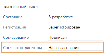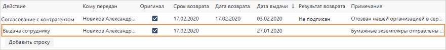Для контроля возврата документа используйте список «Документы у сотрудников». 6.После возврата бумажных экземпляров документа от контрагента в карточке документа в группе полей «Жизненный цикл» в поле Согл. с контрагентом вручную укажите значение Подписан или Не подписан. 7.На закладке «Выдача» добавьте отметку о возврате документа: