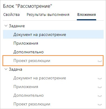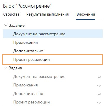 Предположим, в задании нужно отображать или скрывать группу вложений «Проект резолюции» задачи на рассмотрение документа в зависимости от условий: