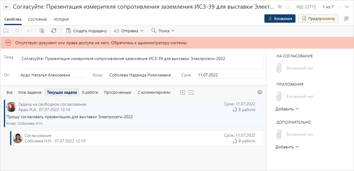 Для документа установлен строгий доступ. Проинформируйте инициатора задачи о том, что у исполнителя нет прав на документ: •если инициатор забыл выдать исполнителю права на документ, попросите его сделать это, а затем передайте исполнителю, что он может приступать к выполнению задания; •если инициатор намеренно не выдал права исполнителю, попросите его прекратить задачу. |