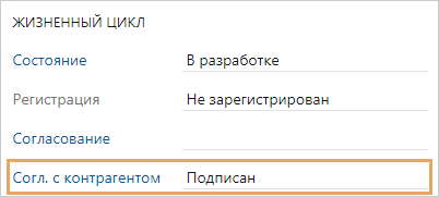 Согласуйте проект договорного документа удобным для вас и контрагента способом, например по email. Если нужно фиксировать достигнутые договоренности, отразите их в карточке договорного документа в поле Примечание. Если объем переписки по договоренностям большой: 1.Создайте простой документ. Укажите имя документа в формате «Согласование проекта документа <Наименование проекта документа> с <контрагент>». 2.Свяжите созданный документ с проектом договорного документа как Связанный. Если контрагент в ходе согласования прислал вам подписанный проект договорного документа: 1.Занесите поступивший документ в систему, при этом: •если документ поступил в бумажном виде, то занесите его скан-копию в новую версию электронного документа; •если документ поступил по email, то сохраните локально вложенный в электронное письмо документ и импортируйте его в систему в новую версию электронного документа. 2.В карточке документа в поле Согл. с контрагентом установите значение Подписан.