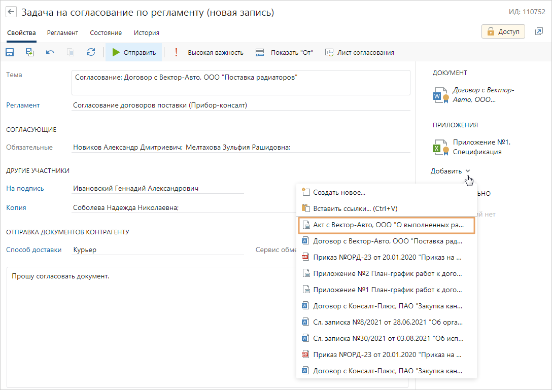 Инициатор отправляет договор на согласование по регламенту. Необходимо, чтобы в ходе согласования вместе с договором также был подписан финансовый документ, например акт выполненных работ. В задаче на согласование акт не отображается во вложениях, так как между актом и договором проложена связь «Финансовые документы», а не «Приложение».