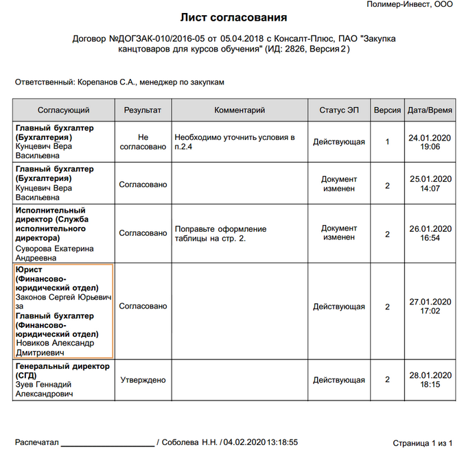 2.После согласования документа выполните задание на согласование с соответствующим результатом. 3.При необходимости занесите в новую версию документа отсканированную копию бумажного экземпляра документа с результатом согласования согласующего. В примечании к версии укажите «Отсканированная копия документа. <Результат согласования с сотрудником, не работающим в системе>». |
