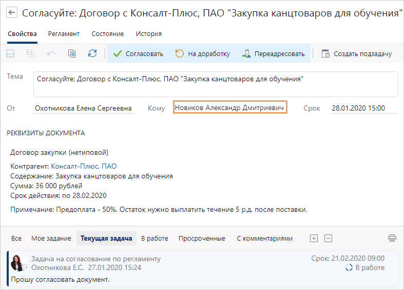 При использовании решения: •учитывайте, что ответственный сотрудник получает права на объекты системы того сотрудника, которого он замещает; •выстраивается непрерывный и контролируемый процесс согласования; •обеспечивается прозрачность согласования за счет отображения на закладке «Регламент» в карточках задачи/задания реального согласующего, а в листе согласования – исполнителя задания на согласование и согласующего.