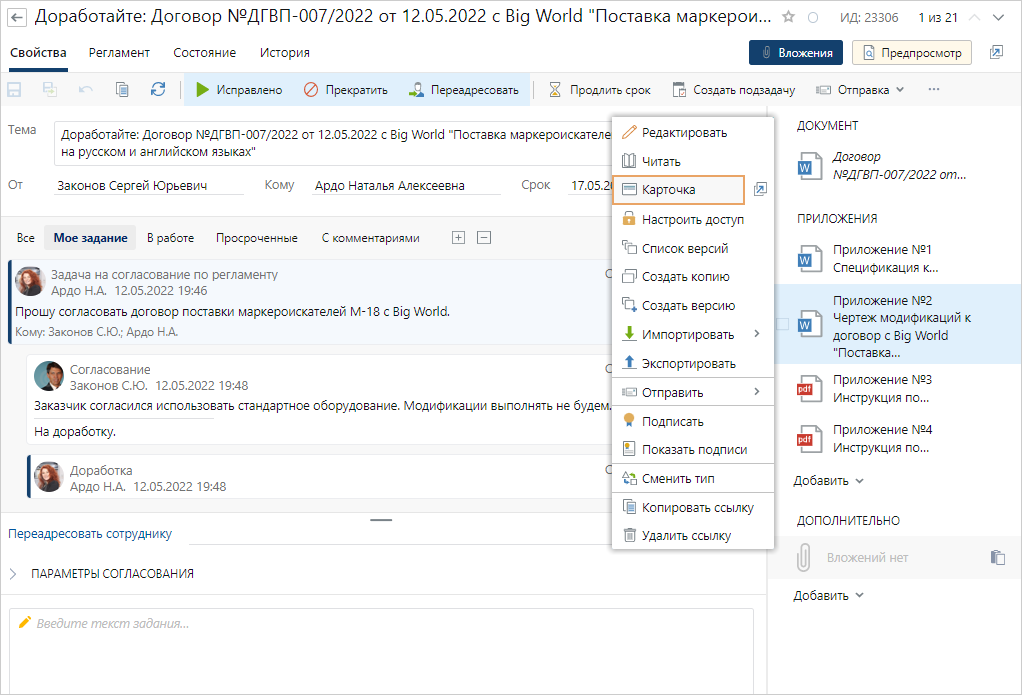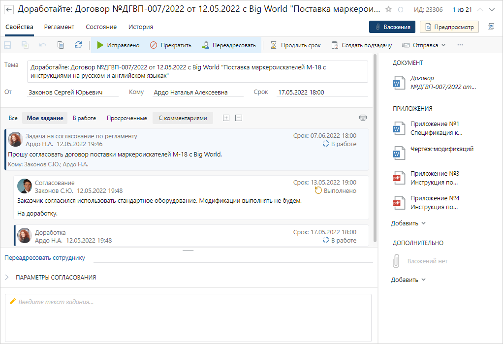 В ходе согласования по регламенту инициатор получает задание на доработку. Согласующий просит его удалить приложение, привязанное к ведущему документу по ошибке.