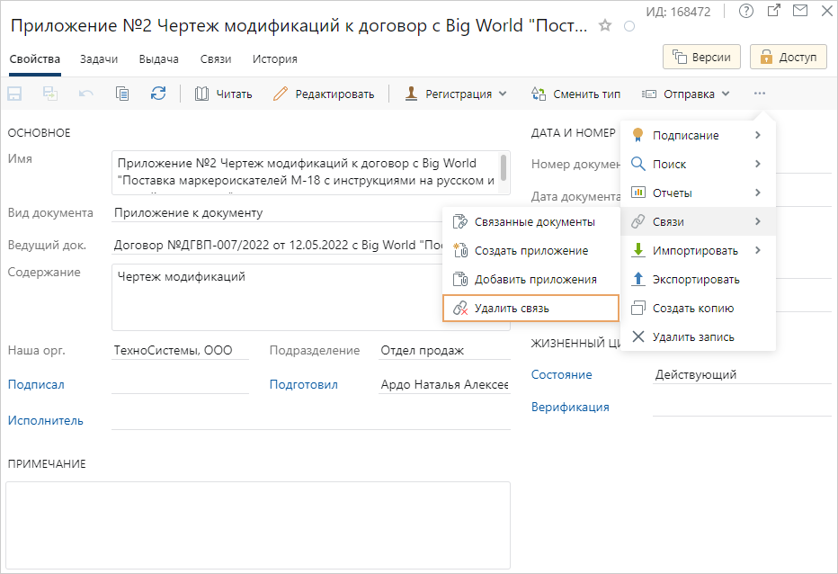 << Click to Display Table of Contents >> Практические рекомендации > Работа с документами Как удалить связь приложения с основным документом в задании на доработку |