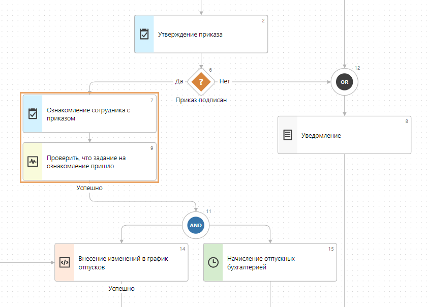 Это решение требует минимального количества модификаций. Кроме того, не нужно разделять вариант процесса «Задача на ознакомление с приказом».