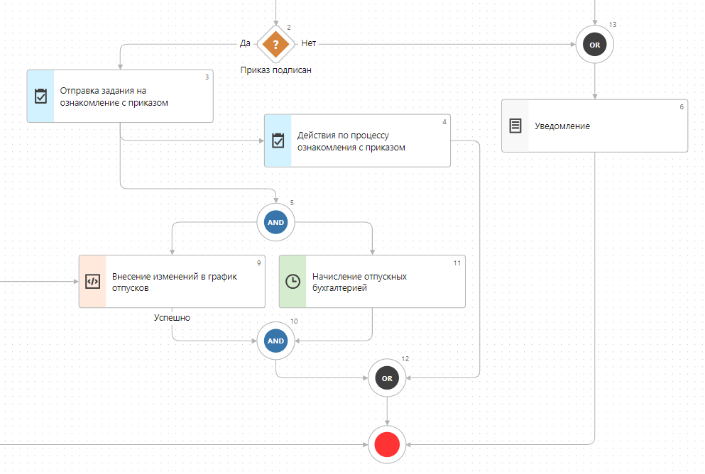 •во втором варианте процесса должны выполняться остальные действия по процессу: подписание приказа и отправка уведомления заинтересованным лицам.