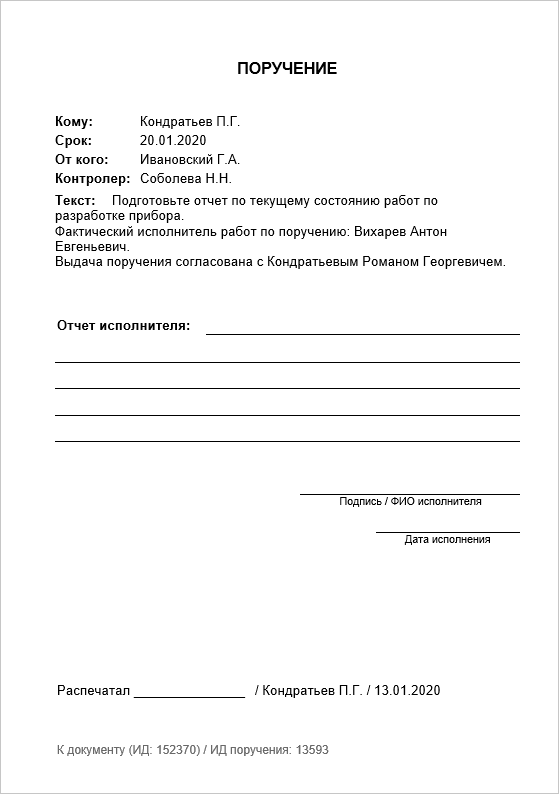 Откроется документ в текстовом редакторе. Распечатайте документ, поставьте свою личную подпись в поле Распечатал и передайте поручение сотруднику.