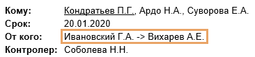 •для исполнителя подчиненного поручения значение в поле От кого отображается в формате: «автор ведущего поручения» -> «исполнитель ведущего поручения»: