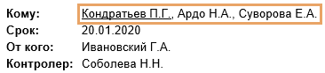 В зависимости от поручения содержимое документа может изменяться: •если в поручении есть соисполнители, то они также отображаются в поле Кому. При этом ФИО исполнителя указано первым и подчеркнуто: