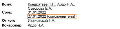 •если в поручении задан индивидуальный срок для соисполнителей, то он также отображается в поле Срок с подписью «соисполнители»: