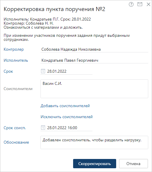 При корректировке конкретного пункта составного поручения можно изменить: •исполнителя и срок для него, когда поручение находится в работе; •соисполнителей и срок для них, и контролера, когда поручение в работе или на приемке. Чтобы скорректировать сотрудников или срок в пункте составного поручения: 1.В табличной части карточки выберите пункт составного поручения, который нужно изменить, и нажмите на кнопку Скорректировать пункт: 2.В открывшемся диалоге измените данные в поле Исполнитель, выбрав нужного сотрудника из выпадающего списка: *Контролер, *Исполнитель. Выберите сотрудника из выпадающего списка. *Срок, *Срок соисп. Выберите дату исполнения для пункта поручения. Срок для соисполнителей не может быть больше срока для ответственного исполнителя. Примечание. При корректировке срока в главном поручении сроки в подчиненных поручениях не изменятся. Подчиненные поручения нужно скорректировать отдельно. Соисполнители. Чтобы изменить состав соисполнителей, нажмите на ссылку Добавить соисполнителей или Исключить соисполнителей. В открывшемся диалоговом окне выберите из списка сотрудника для совместной работы над поручением. *Обоснование. Укажите причину корректировки пункта поручения. Причина появится в уведомлении о корректировке поручения. 3.Нажмите на кнопку Скорректировать. 4.После корректировки обновите карточку поручения, чтобы в ней отобразилась актуальная информация. Примечание. При корректировке поручения можно изменить исполнителя. Если в поручении были указаны соисполнители, после корректировки их задания придут на контроль новому исполнителю. Если прежний исполнитель создавал подчиненные поручения вручную, они придут на контроль ему. В результате изменения поручения прекращаются: •задания прежних участников работ по поручению; •подзадачи, в которых участвовали исключенные сотрудники. Например, задачи на запросы отчетов; •запросы о продлении срока составного поручения, если срок был изменен. Если срок для исполнителя был скорректирован, то срок соисполнителя изменится автоматически на ту же разницу во времени, какой она была до корректировки. Например, до корректировки срок для исполнителя был 4.02.2022, а срок для соисполнителя 2.02.2022. После изменения срока для исполнителя на 9.02.2022 срок для соисполнителя изменится на 7.02.2022. Сроки пересчитываются в рабочих днях и часах. ПРИМЕЧАНИЕ. Если система не смогла определить срок соисполнителя, например, он выпал на прошедшее время, то установится текущий день. Участникам работ по поручению придет уведомление о корректировке поручения. В уведомлении указывается информация об изменении срока, обоснование причины корректировки, кто из сотрудников теперь назначен контролером, исполнителем и соисполнителем, а кто исключен из списка участников.