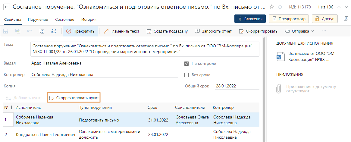 Совет. Если в составном поручении менее 5 пунктов и скорректировать нужно только часть из них, то рекомендуется корректировать поручение в табличной части карточки. Если нужно скорректировать все пункты, то используйте кнопку Скорректировать на панели действий.