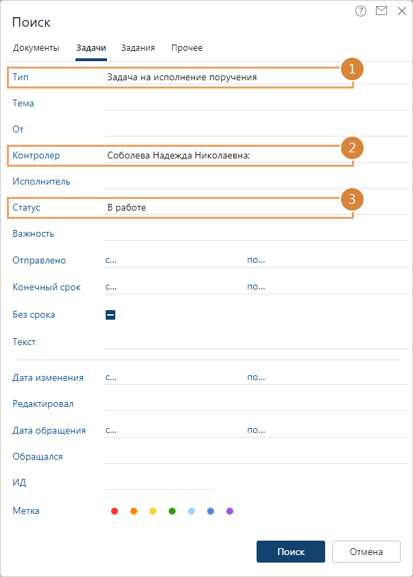 Также поручения можно искать по другим критериям через общий поиск, например, по теме, исполнителю, статусу, контролеру.