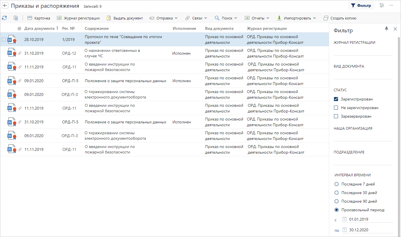 •поиска приказов и распоряжений по заданным параметрам с помощью панели фильтрации. Например, можно посмотреть список приказов, зарегистрированных в определенном журнале регистрации;