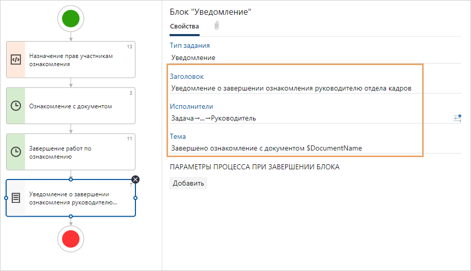 •в поле Заголовок укажите новое название блока, например «Уведомление о завершении ознакомления руководителю отдела кадров»;