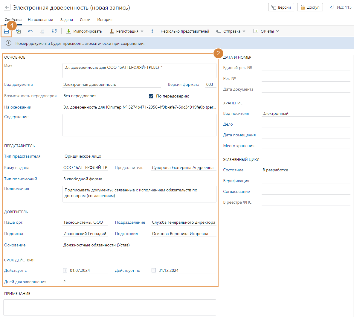 4.Сохраните карточку документа. При этом документу присваивается регистрационный номер, который можно изменить в ходе согласования доверенности.
