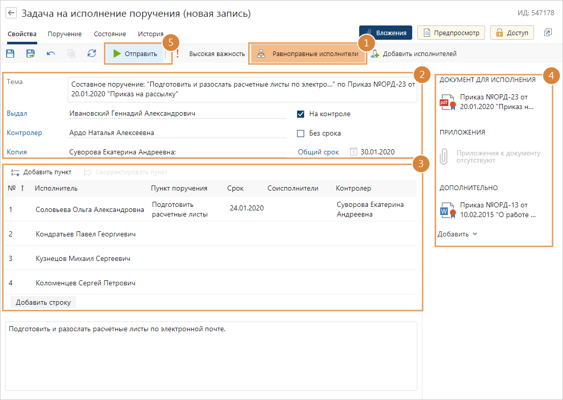 5.Отправьте поручение исполнителям. При этом учтите условия отправки: