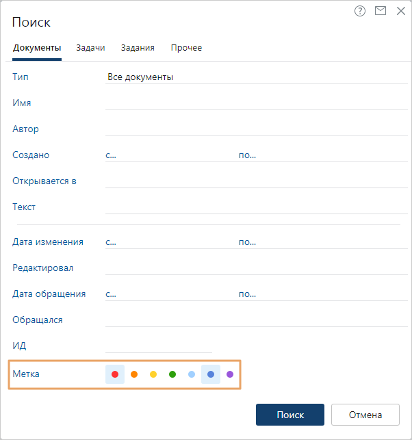 Чтобы найти документы, задачи, задания или папки по цвету метки, воспользуйтесь расширенным поиском. Для этого выберите тип объекта и цвета для поиска в поле Метка: