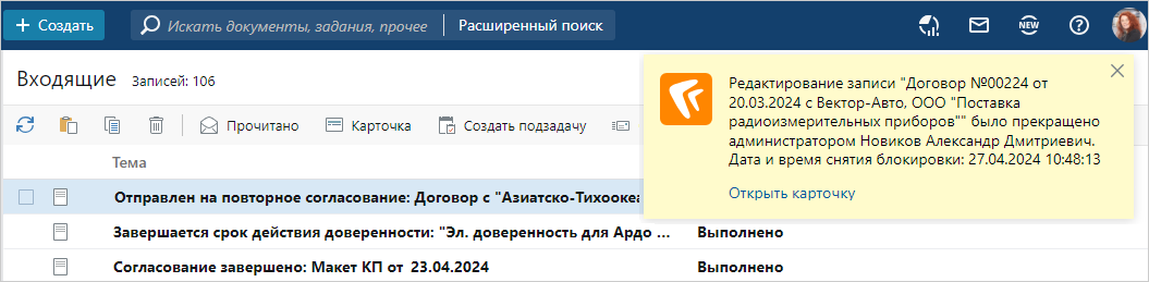 Для сотрудника, который заблокировал карточку, автоматически открывается папка Входящие, и появляется сообщение о том, что администратор снял блокировку: