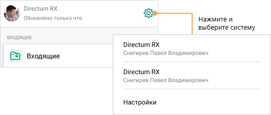 Добавить систему. Добавить другую систему Directum RX для одновременной работы в нескольких системах через приложение. В открывшемся окне укажите адрес сервиса, логин и пароль. Можно добавить до трех систем Directum RX. Чтобы переключиться между системами, нажмите на имя или фотографию сотрудника вверху экрана и выберите нужный пункт в списке: