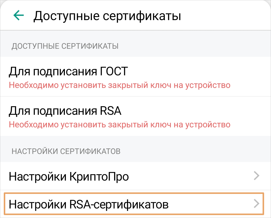 8.В открывшемся окне нажмите на пункт Настройки RSA-сертификатов: