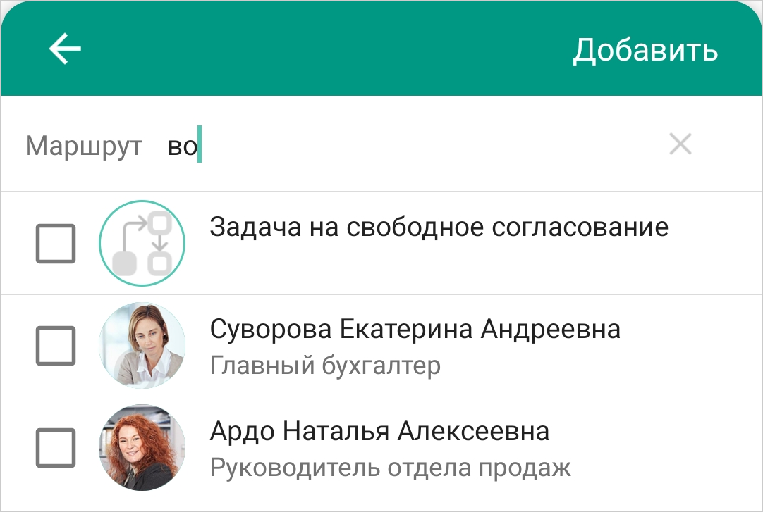 3.Укажите маршрут задачи. Можно выбрать роль, сотрудника, процесс или правило согласования. Часто используемые варианты отображаются в верху списка. Для быстрого поиска начните вводить нужное значение в строке поиска: