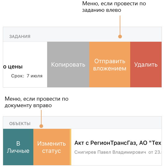 Если в списке провести по объекту влево или вправо, открывается его контекстное меню: