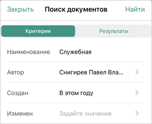 . В открывшемся окне выберите критерии для поиска, например название и автора документа, а также дату создания:
