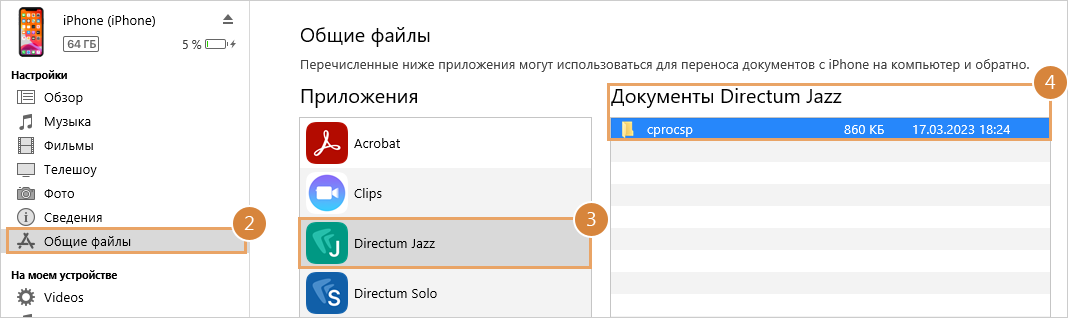 4.Перейдите в список «Документы Directum Jazz» и сохраните папку cprocsp с подпапками локально на компьютер. Подробнее о копировании файлов см. в руководстве пользователя iTunes, в статье «Перенос файлов между ПК и устройствами при помощи iTunes».