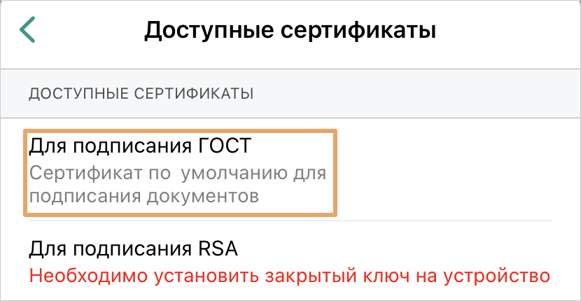 •в списке доступных сертификатов в настройках приложения: