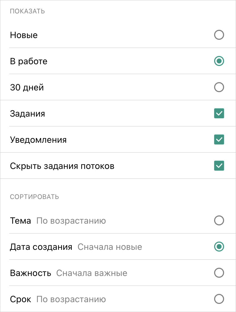 По умолчанию в папке «Входящие» не отображаются задания, которые попадают в папки потоков. Для этого в окне сортировки и фильтрации установлен флажок Скрыть задания потоков. Снимите флажок, если хотите, чтобы задания из папок потоков отображались в папке «Входящие».