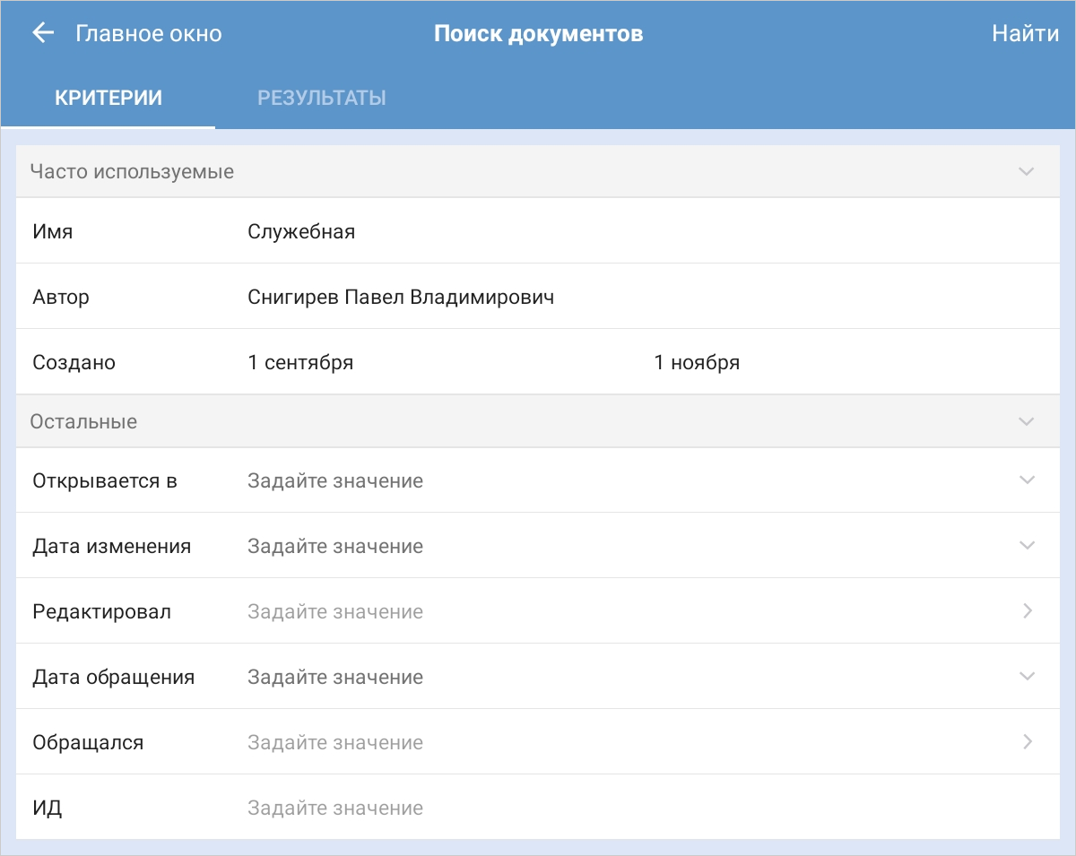 Совет. Критерии поиска, которые используются чаще всего, автоматически добавляются в группу «Часто используемые». Если нужных критериев там не оказалось, разверните группу «Остальные».