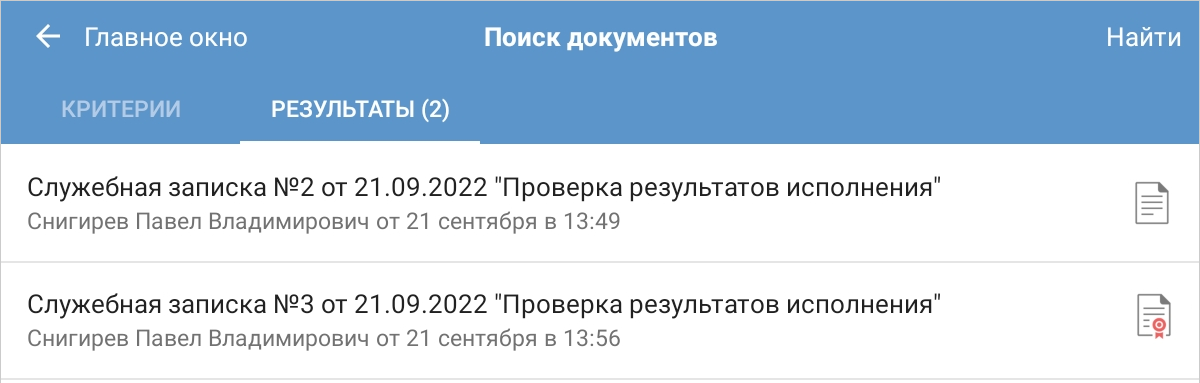 . В открывшемся окне выберите критерии для поиска, например название и автора документа, а также дату создания: