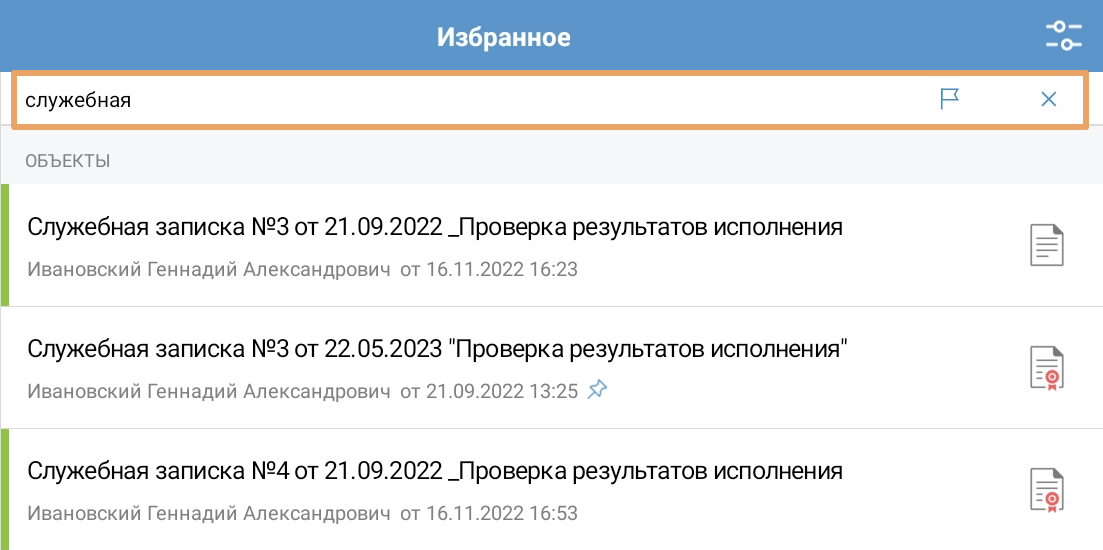 Также объекты в списке удобно фильтровать по цветному статусу. Для этого в строке поиска нажмите на кнопку