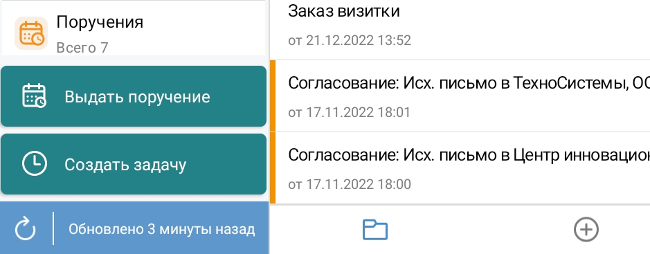 На планшете по умолчанию на главном экране, а также в папках доступны кнопки быстрых действий Выдать поручение и Создать задачу.