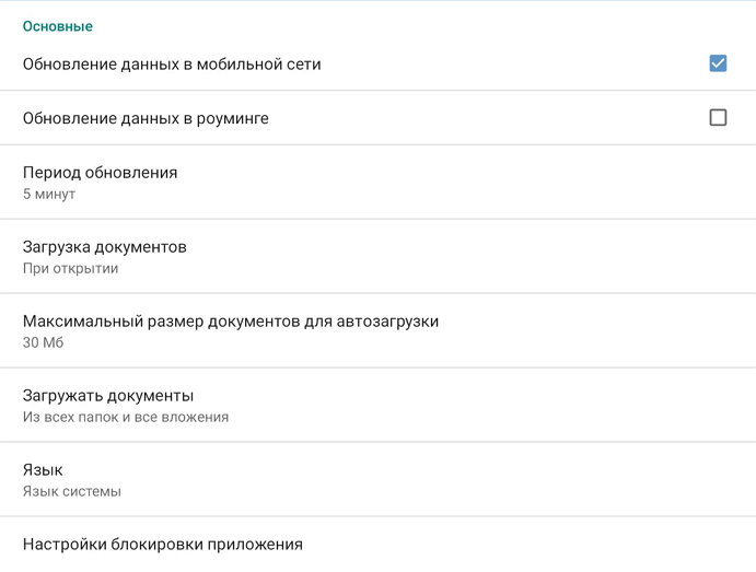 Обновление данных в мобильной сети. Возможность автоматического обновления данных при подключении по мобильной сети. По умолчанию флажок установлен. Если его снять, загружать изменения нужно вручную. Например, чтобы обновить все данные приложения, нужно провести по экрану сверху вниз, а чтобы загрузить содержимое онлайн-папки – зайти в нее. Обновление данных в роуминге. Возможность автоматического обновления данных при работе в роуминге. Настройка доступна для изменения, если установлен флажок Обновление данных в мобильной сети. По умолчанию обновление данных в роуминге выключено, и загружать изменения нужно вручную. Период обновления. Частота обновления данных. Значение по умолчанию 5 минут. Загрузка документов. Режим загрузки документов в клиентское приложение. Возможные значения: •При открытии. Загрузка документов осуществляется только при обращении к документу. Значение по умолчанию; •Автоматически. Загрузка документов осуществляется автоматически, вне зависимости от типа подключения; •Автоматически, только по Wi-Fi. Загрузка документов осуществляется автоматически только при использовании Wi-Fi подключения. При обращении к документу, который еще не загружен, загрузка будет начата независимо от типа сети. Максимальный размер документов для автозагрузки. Максимальный размер документов, которые могут быть автоматически загружены в клиентское приложение при обновлении данных. Ограничивается размер исходного документа, а не конвертированного в формат PDF. Доступно для изменения, если в настройке Загрузка документов выбран автоматический режим. Значение по умолчанию 30 МБ. Загружать документы. Папки, из которых документы будут загружаться автоматически. Доступно для изменения, если в настройке Загрузка документов выбран автоматический режим. Можно загружать документы, вложенные в задания, вложенные в задачи, из Избранного и из Личных. Можно выбрать несколько значений одновременно. По умолчанию выбраны все значения. Язык. Язык интерфейса приложения. Можно выбрать язык операционной системы, русский или английский. По умолчанию выбран язык системы. Настройки блокировки приложения. Установка PIN-кода для разблокировки приложения. Если настройка включена, приложение блокируется после 15 минут бездействия, а также при его закрытии или блокировании устройства. Добавляемый PIN-код автоматически проверяется на сложность. Если он небезопасен, в Solo отображается соответствующее сообщение. В этом случае придумайте другой код. Примеры небезопасных PIN-кодов: •повторяющиеся цифры: 1111, 191919; •последовательные цифры: 123456, 98765; •комбинации, похожие на год рождения: 1989, 2013. После создания PIN-кода становятся доступны действия Разрешить использовать биометрию, Изменить PIN-код и Удалить PIN-код. Использовать биометрию можно, если такая опция включена в настройках мобильного устройства. При этом в приложении не поддерживается разблокировка по сетчатке глаза или распознаванию лица. Удаление PIN-кода или включение биометрии неактивны, если администратор настроил политики блокировки для мобильного приложения. После установки PIN-кода для его изменения или удаления нужно подтвердить ранее введенный PIN-код. Экран для ввода отображается после нажатия на пункт меню Настройки блокировки приложения. Совет. Если вы забыли установленный ранее P