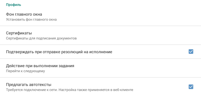 Фон главного экрана. Можно выбрать любое изображение, хранящееся на устройстве. Эта настройка доступна только на планшетах. Сертификаты. Сертификаты для подписания документов. В открывшемся окне отображается список сертификатов сотрудника, зарегистрированных в Directum RX. Подписание документов электронной подписью необходимо настроить. Затем можно выбрать, какой из сертификатов использовать по умолчанию. Подтверждать при отправке резолюций на исполнение. Признак запроса подтверждения при отправке резолюций на исполнение. Действие при выполнении задания. Действие, которое будет происходить после выполнения задания. Возможные значения: •Перейти к следующему –открывается следующее задание или уведомление в списке. Значение по умолчанию; •Вернуться к списку – открывается список всех заданий текущей папки. Предлагать автотексты. Если флажок установлен, при добавлении комментария к задаче или заданию можно использовать автотексты. Они доступны, если устройство находится в сети. Настройка также применяется в проводнике Directum RX. Если автотексты выключены, статистика по часто используемым фразам не ведется.